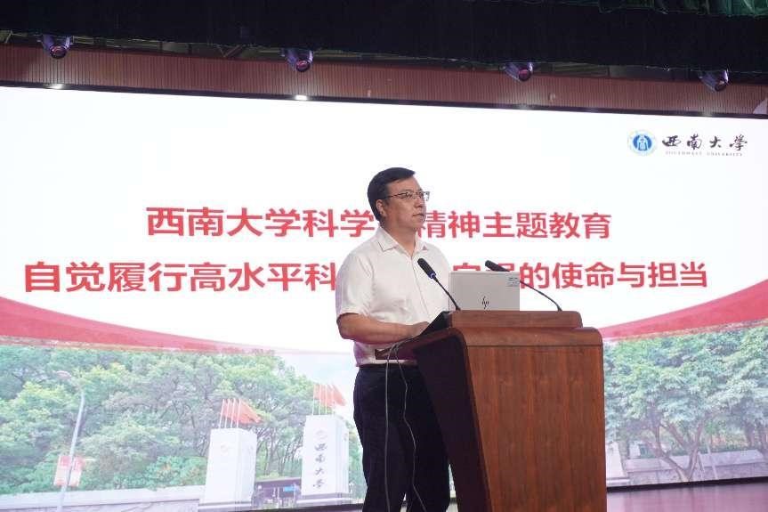 为继承发扬以国家民族命运为己任的爱国主义精神,发扬以爱国主义为底色的科学家精神,推动新时代科技强国建设,9月15日,学校在圆顶三楼报告厅举行博士研究生新生入学教育之传承科学家精神主题教育活动。党委常委、副校长王进军,党委研究生工作部、科学技术处、科协、北碚区科协相关负责人及学校2023级全体在校博士研究生参会。会议由党委研究生工作部部长秦松主持。