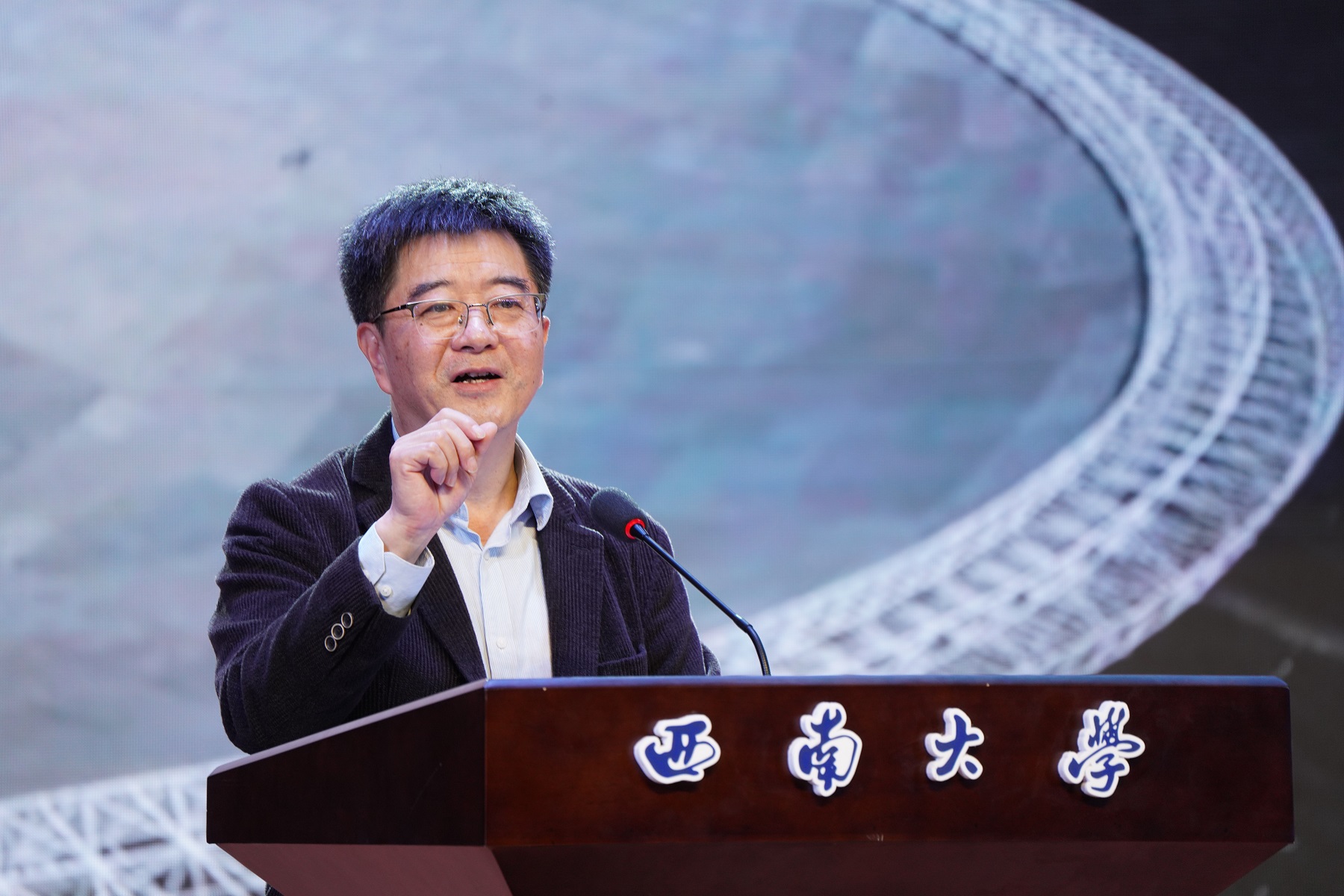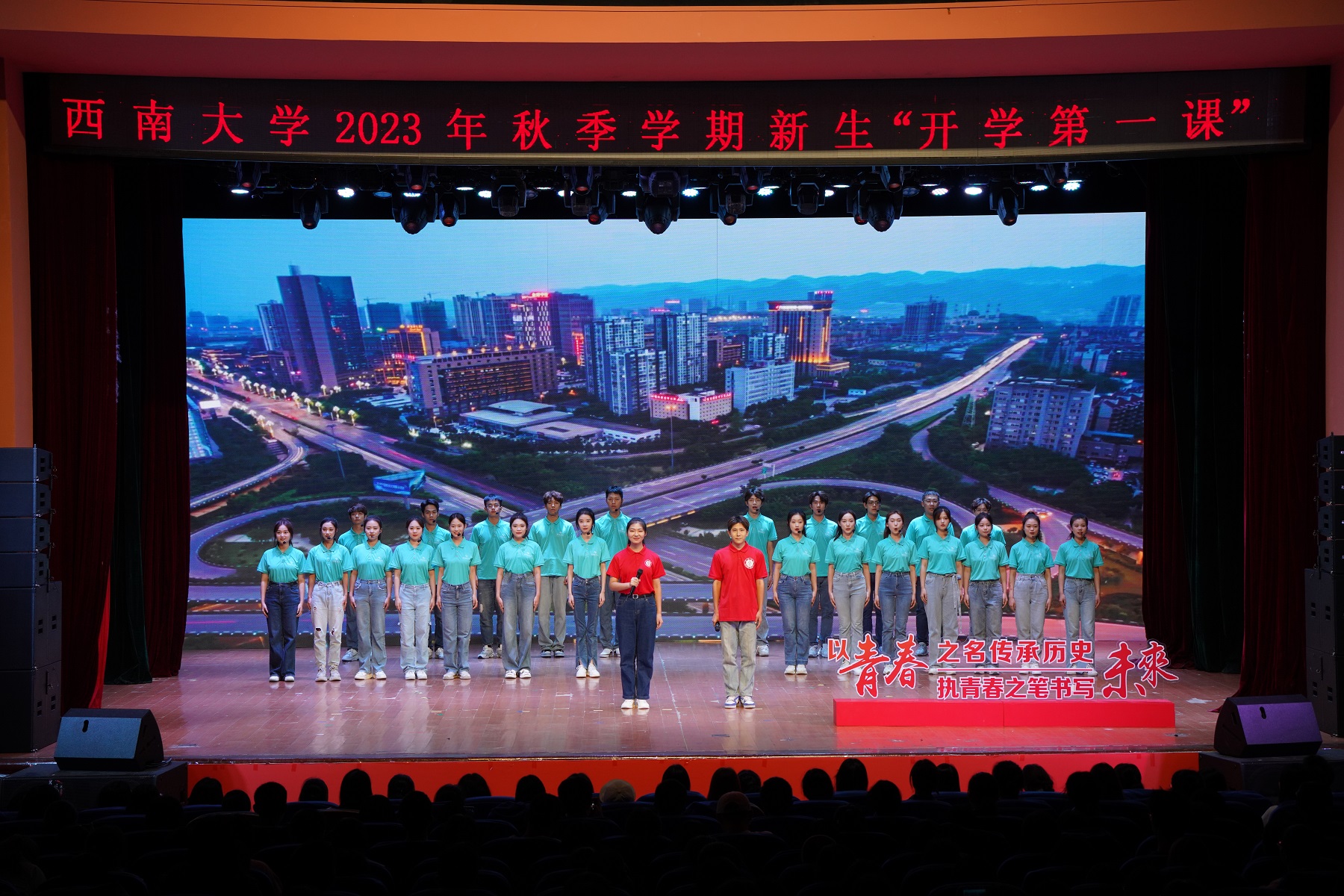 在第三篇章“致未来”中,学校党委书记李旭锋深情寄语2023级新同学以青春之名传承历史,执青春之笔书写未来。他围绕学校校训展开,从厚植文化之根,感悟西大人的坚守与追寻;赓续文化之魂,体认西大人的理想与情怀;传承文化之脉,践诺西大人的奋进与担当三个方面为新生们刻以“含弘光大,继往开来”共同的文化印记,探寻共同的“精神密码”。李旭锋勉励同学们保持独立思考、瞄准学科前沿、注重实践积累,深深扎根脚下这块土地,自觉传承文化之魂脉,继续发扬精神之力量,不负青春、不负韶华,创造属于青年人的新时代!