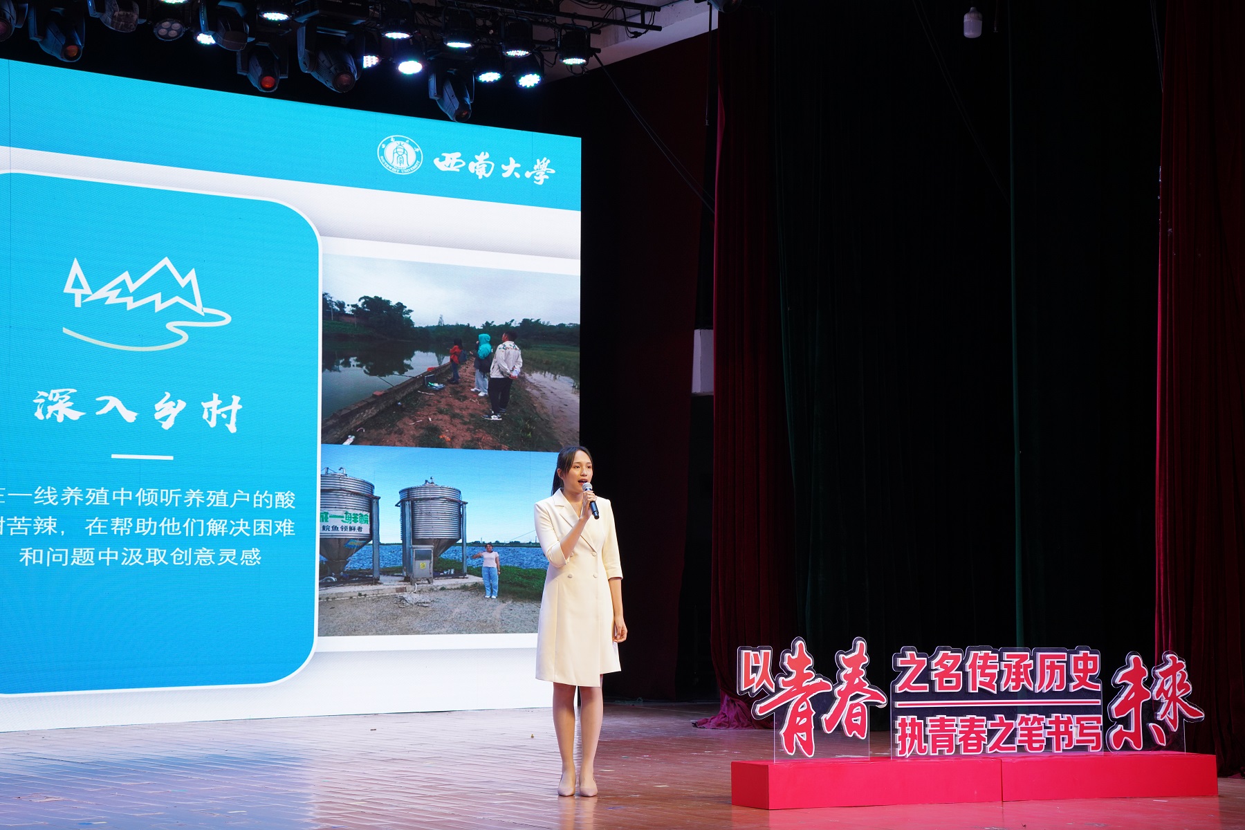 第二篇章“致青春”邀请两位高年级同学为大家生动讲述自己的励志故事。来自水产学院的硕士研究生陈玥瑚以《做一条奋力游动的鱼,奔向星辰大海》为题,声情并茂地与学弟学妹分享了自己的奋斗历程。曾荣获“中国大学生自强之星标兵”称号的她用自己丰富的实践所得诠释了自强不息、求真务实等优秀品德的内涵。