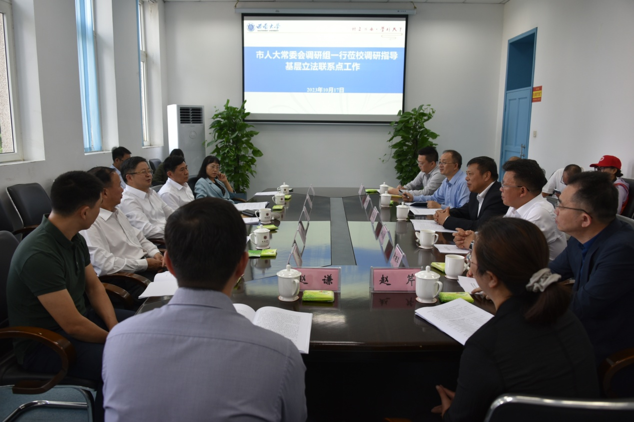 为深入贯彻落实党的二十大精神和2023年全国地方立法工作座谈会精神,10月17日,重庆市人大常委会副主任欧顺清来校调研市人大常委会贝博艾弗森代言体育官网国家治理学院基层立法联系点建设及运行情况。市人大常委会副秘书长邓炳国、北碚区人大常委会主任徐永德、贝博艾弗森代言体育官网校长张卫国等陪同调研。