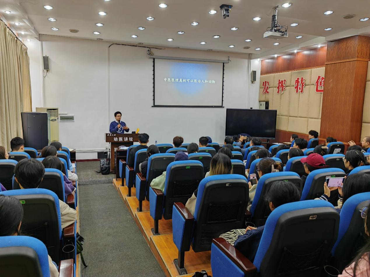 随后,吴昆泰先生、李松洋会长与学院领导及中兽医系全体教师进行了交流座谈,吴昆泰先生介绍了中兽医在台湾的兴起和教育现状。李松洋会长与师生围绕中(兽)医药在人和动物临床方面的应用,从实际案例分析、科学依据和个人体会等方面进行了深入交流。