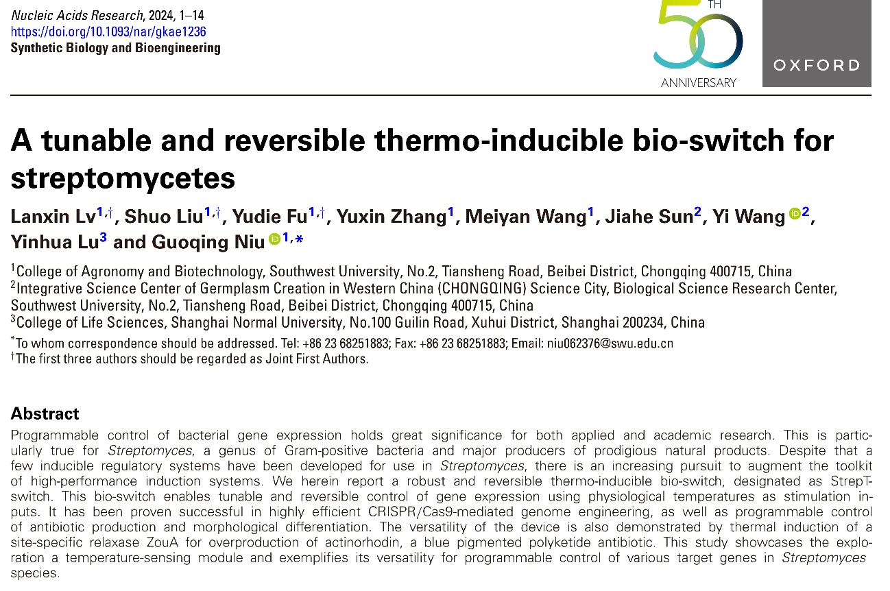 基因表达的精确调控是代谢工程与合成生物学的核心技术之一,是实现高值化合物在微生物细胞工厂中“智造”的重要手段。链霉菌是一类具有重要经济价值的革兰氏阳性菌,具有产生多种生物活性天然产物的能力,在生物医药、农业等领域应用广泛。然而,链霉菌的基因表达调控复杂,经过几十年的研究,仅有少数几个基因诱导表达系统可供选择,且这些诱导表达系统存在一定的局限性,如高渗漏表达、诱导剂毒性、诱导剂易降解和不可逆性等问题。针对这些难题,牛国清研究员团队先后利用合成生物技术开发了两套链霉菌诱导表达系统:纤维二糖诱导表达系统(ACS Synthetic Biology 2021)和鼠李糖诱导表达系统(ACS Synthetic Biology 2024)。这两套诱导表达系统解决了高渗漏表达和诱导剂毒性问题,但诱导剂可被当作碳源利用,且添加纤维二糖或鼠李糖后的诱导过程是不可逆的。近日,牛国清研究员团队在链霉菌基因表达调控领域取得新进展,相关研究论文 “A tunable and reversible thermo-inducible bio-switch for streptomyces” 于国际知名学术期刊《Nucleic Acids Research》(《核酸研究》)正式发表。该研究成功构建了一种基于温度感应调控因子 RheA 的新型温度诱导基因表达调控系统(StrepT-switch),为链霉菌的基因工程改造及天然产物合成研究开辟了新路径。