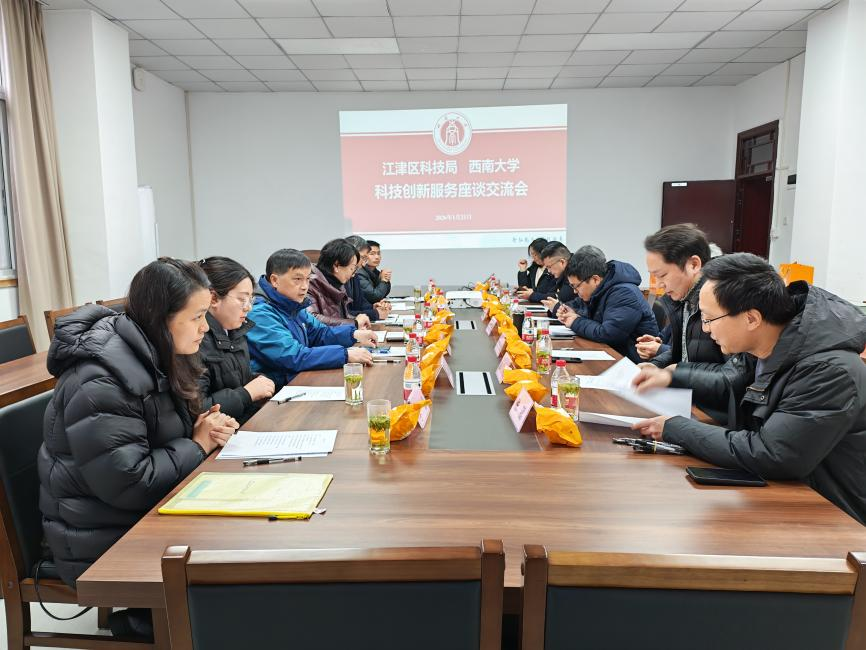 日前,江津区科技局有关负责人率部分重点企业代表到学校开展专题科技服务交流。科学技术发展研究院、社会服务处、食品科学学院相关负责人,以及学校科技特派员代表参会。