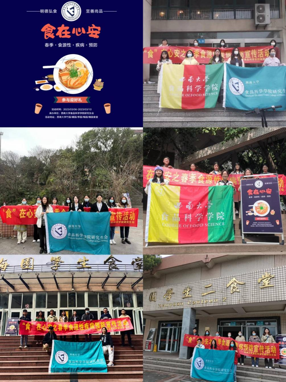 3月6日至3月10日,由食品科学学院研究生会主办,食品科学学院研究生会实践部承办的“‘食’在心安之春季食源性疾病预防宣传”公益活动分别在贝博艾弗森代言体育官网竹园、橘园、李园、梅园、楠园五个园区食堂顺利举行。活动参与者由研究生会成员和志愿者共50人组成,活动旨在提高同学们对食品安全的认知和预防意识。
