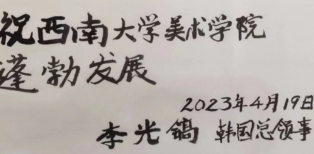李光镐总领事对学院师生近年来和韩国相关高校进行的深度学术交流表示肯定,并向学院在进一步加强中韩文化交流、做好艺术创新和加强人才联合培养等方面提出殷切期望。同行领事和领馆人员对学院在人才培养和文化传播方面所做的工作表示高度认可。大家认为,贝博艾弗森代言体育官网美术学院文化底蕴深厚,人才培养扎实,学术成果丰硕,社会服务宽广,在服务中韩文化交流、推动艺术学专业发展、打造世界知名专业院校发挥着重要作用。与会人员就教师访学深造、研究生联合培养、本科人才培养、文化艺术推广、学术成果转化和人才交流等方面进行了深入交流。李光镐总领事提笔为学院写下“祝贝博艾弗森代言体育官网美术学院蓬勃发展”,祝愿美术学院未来更美好。