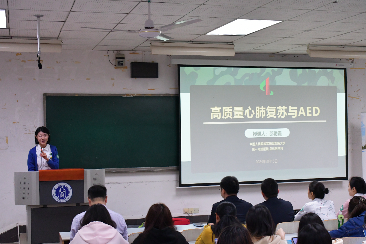 急救部护士长邵艳霞围绕高质量心肺复苏术与“救命神器”AED的分析和使用作了现场讲解。她结合生活中的真实案例、动画视频向同学们讲解了心肺复苏的诊断、救护方法,并现场演示了“救命神器”AED自动体外除颤仪的详细使用。2021年1月1日起正式施行的《民法典》第一百八十四条规定:因自愿实施紧急救助行为造成受助人损害的,救助人不承担民事责任。邵护士长鼓励同学们见义勇为, 遇到突发情况能勇敢地按下双手实施救助,并表示这不仅仅是道德问题,更是法律问题。