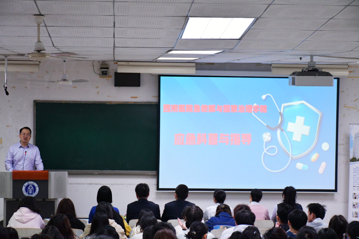 为巩固党史学习教育成果,弘扬红色军医精神,普及医疗急救知识,提高学生健康素养,指导师生就医急诊急救,3月15日国家治理学院与解放军陆军军医大学第一附属医院西南医院急救部联合开展“我为师生办实事”校园急救科普与就诊指导活动。西南医院急救部邵艳霞、陈小雄、张军等医护人员,学院全体辅导员、本科生共300余人一同参加,学院党委副书记李长松主持讲座。