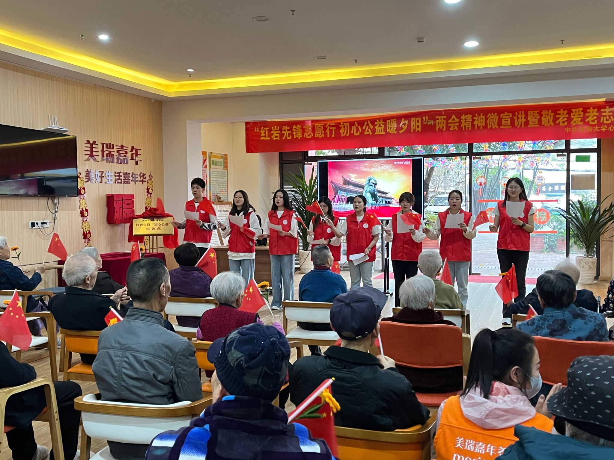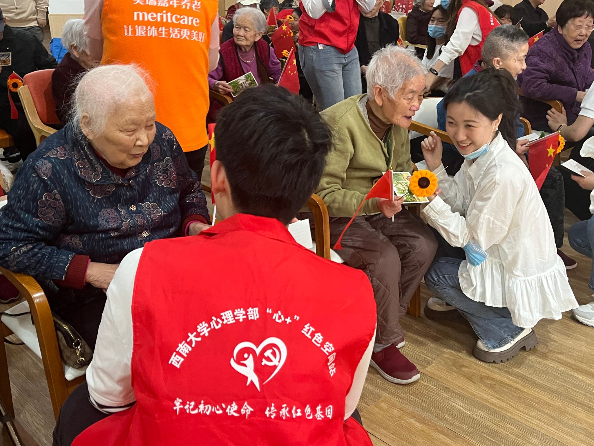 服务点的成立不仅为老年人提供了一个心理关爱的平台,也为党员志愿者提供了一个实践和锻炼的机会。当日,贝博艾弗森代言体育官网心理学部20余名志愿者在服务点开展了“红岩先锋志愿行 初心公益暖夕阳”两会精神微宣讲暨敬老爱老志愿服务活动。心理学部学生党建组织“心+”红色空间站站长丁汝向老年人进行了两会精神微宣讲,讲解了2024年全国两会中关于养老的议题政策,心理学部睡眠神经影像中心学生金巧进行了“宁心助眠”心理健康知识小讲堂,帮助老年人和养老服务工作者了解关于睡眠的心理学知识,并现场教授了深呼吸放松训练、正念冥想助眠等改善睡眠质量的实用技巧。“心+”红色空间站成员和各党支部志愿者与老年人进行“心灵驿站”交流,用明信片为老人们送上和煦温暖的“春日来信”,向老人分享自己所感受的美好春天,互动中或为老人捏捏肩、捶捶背,或仔细聆听老人诉说往事、说烦忧,让老人感受到春天般的温暖和舒适。活动中还穿插了志愿者们精心准备的古筝演奏、歌曲合唱等文艺表演。随着活动的进行,老人的孤独感渐渐得到排解,绽放出幸福的笑容。