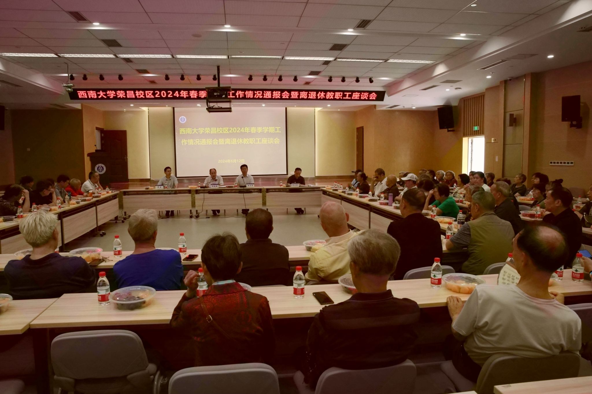 6月12日,贝博艾弗森代言体育官网荣昌校区2024年春季学期工作情况通报会暨离退休教职工座谈会在7B101报告厅举行,校区管委会主任赵永聚主持会议,校区党工委书记周国安通报工作情况。校区党工委副书记、纪工委书记穆奎,副处级组织员包尔泉出席会议,离退休工作办公室全体工作人员及70余名离退休教职工参加会议。