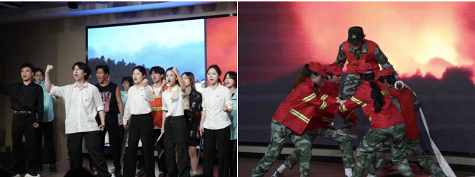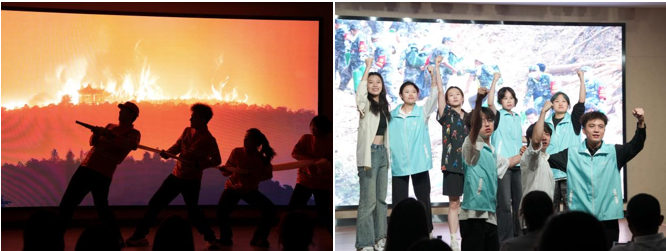 展演剧目《星火长城》是一部以2022年重庆北碚山火为蓝本的现实主义作品,通过讲述消防官兵、干部群众和志愿者们在山火救援中的感人故事。本次思政大课,四组同学用不同的艺术表达方式演绎了《星火长城》剧目,以不同视角、不同重点讲述了山火救援中的场景。