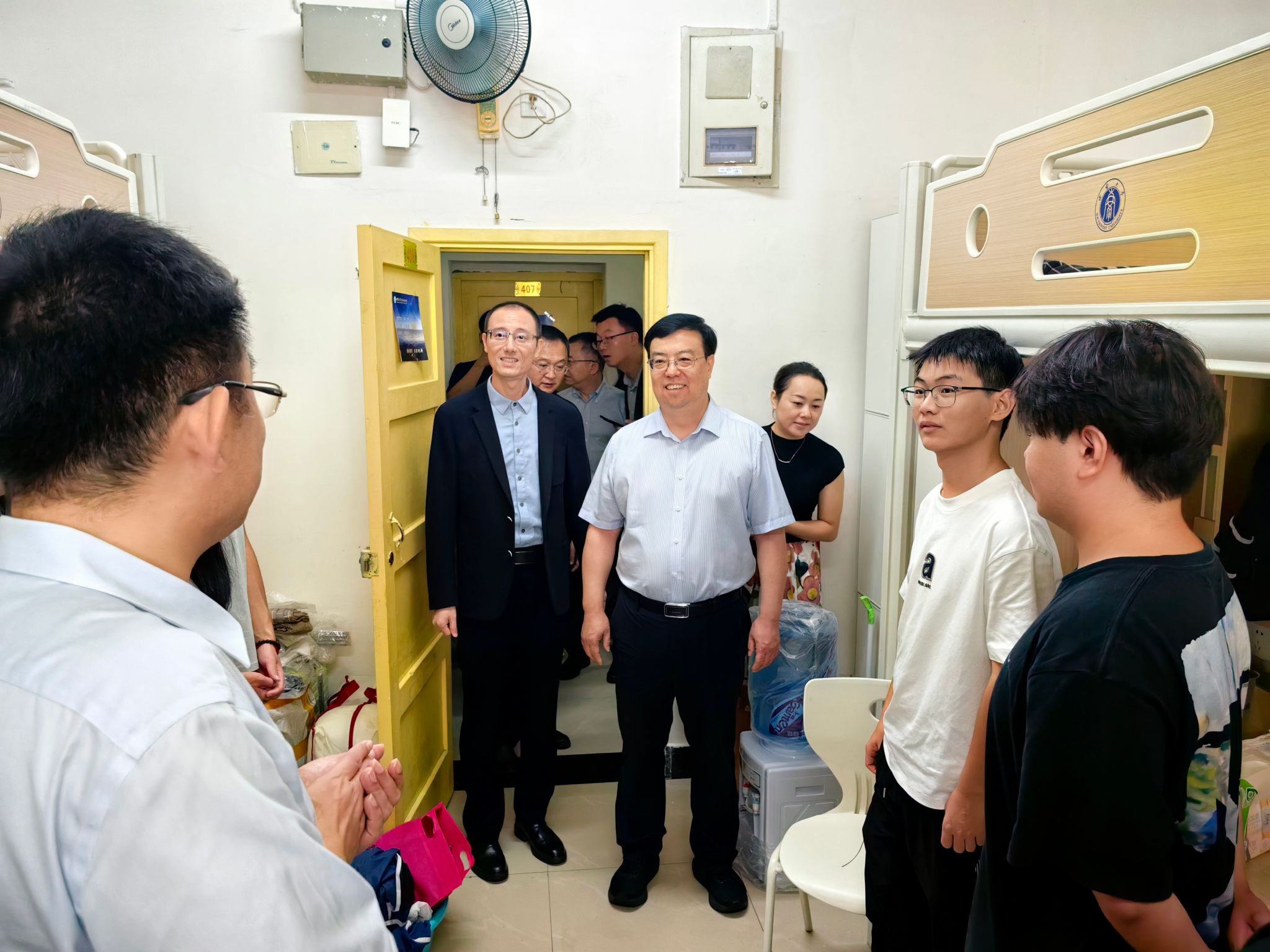 报到当日,校长王进军带队前往校园数智建设大厅、学院(部)分散报到点、学生生活园区等地指导迎新工作。在学生寝室,王进军向新生发放入学大礼包,了解他们的所学专业、宿舍入住感受等情况,勉励大家尽快适应新阶段的学习生活,夯实学业基础,书写青春新篇。