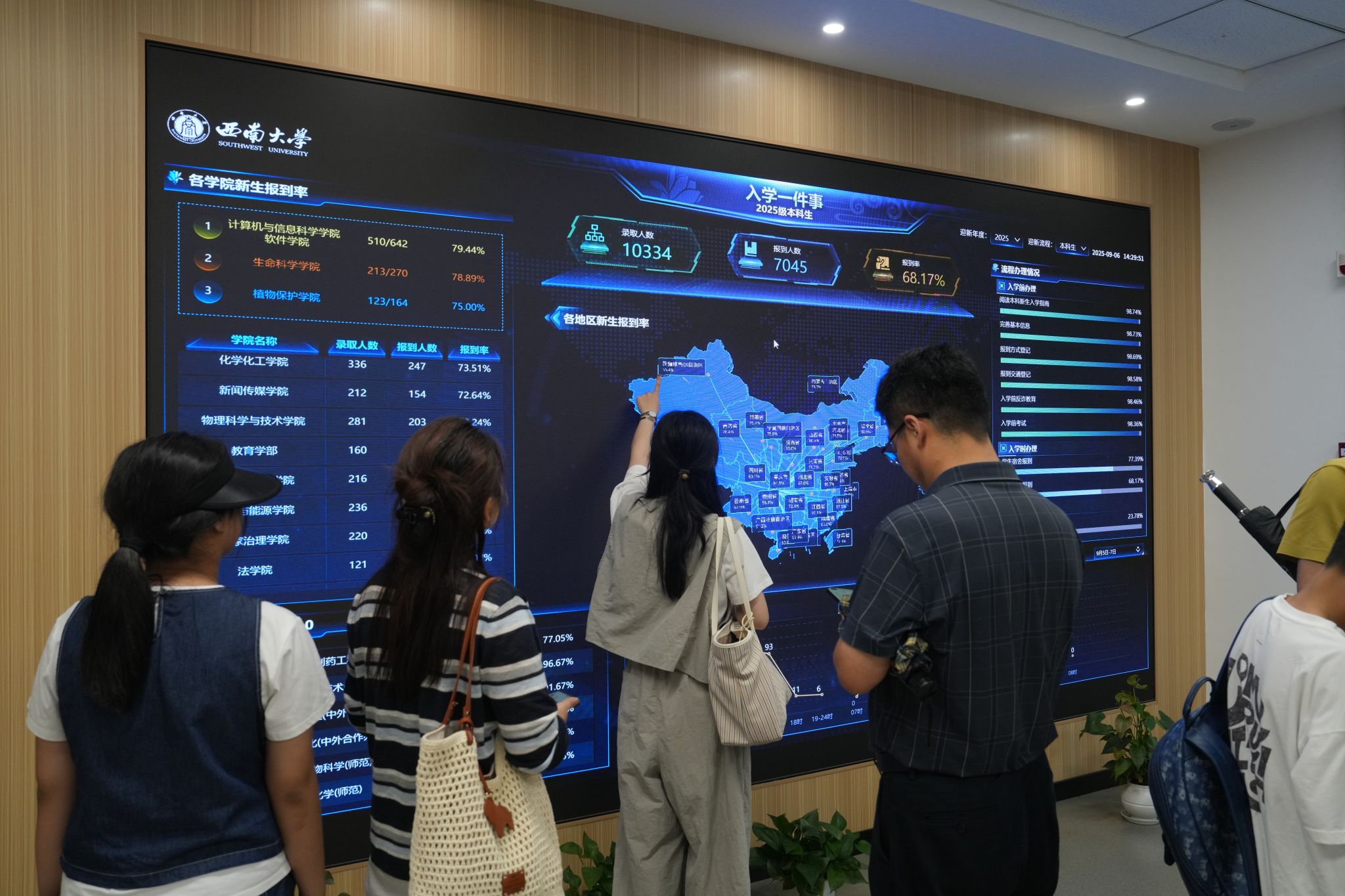 迎新期间,学校在江北机场、重庆西站等重要交通枢纽设有新生接待站,安排专车接运新生到校。在校内,学校设置多个志愿服务站为新生及家长提供路线引导、行李搬运、饮用水发放等各类暖心志愿服务。新生入学“绿色通道”同步开放,确保家庭经济困难新生顺利入学。在各学院(部)报到点,创意迎新展板、欢迎横幅等营造出温馨迎新氛围,同学们还能领取精心设计的新生入学礼袋。