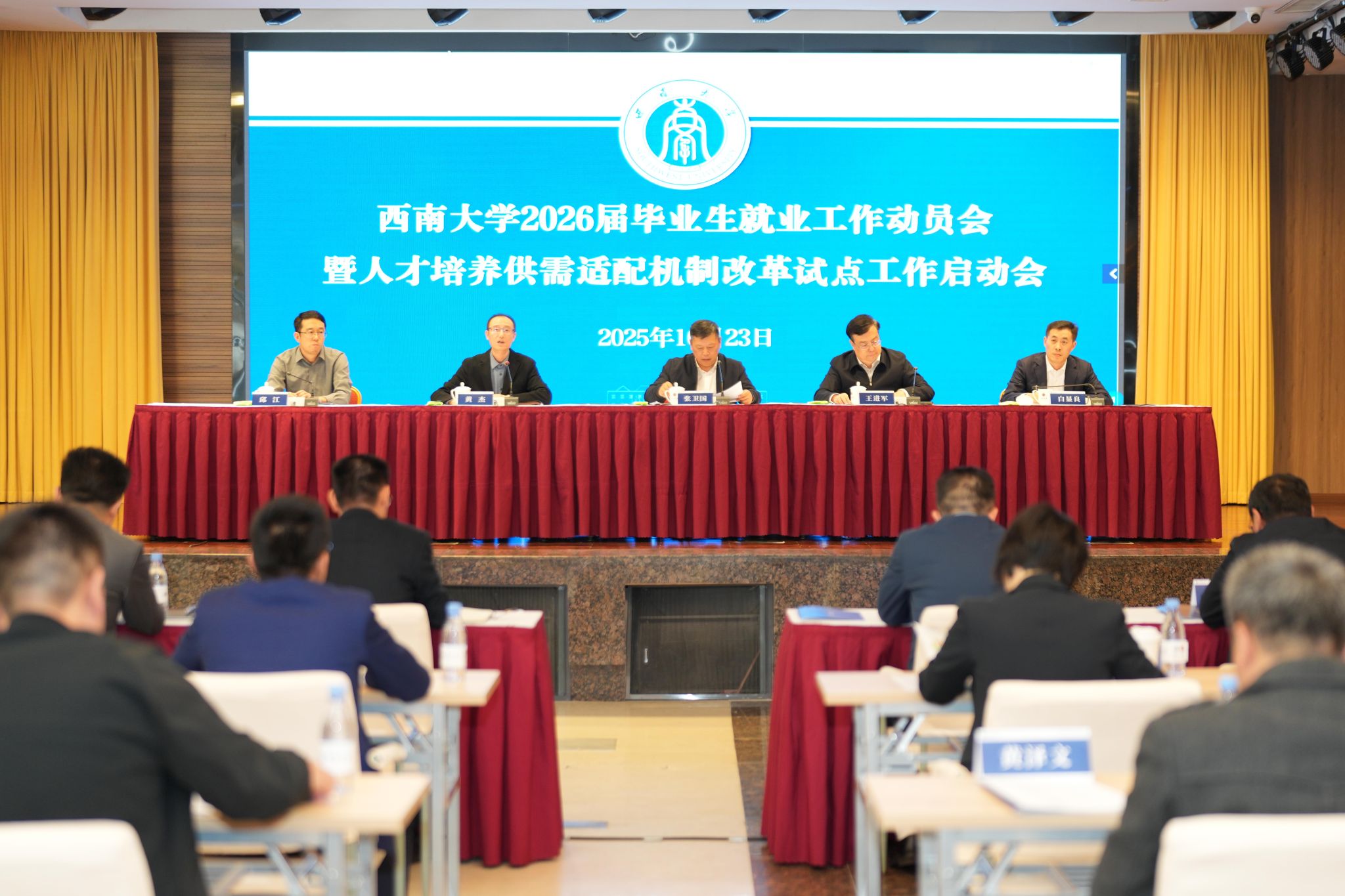 10月23日下午,学校在国际学院报告厅召开2026届毕业生就业工作动员会暨人才培养供需适配机制改革试点工作启动会。党委书记张卫国、校长王进军、党委副书记黄杰、副校长白显良、副校长邱江出席会议。学校就业创业工作领导小组成员单位主要负责人、各二级培养单位党政负责人、分管就业工作与教学工作负责人等参会。